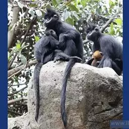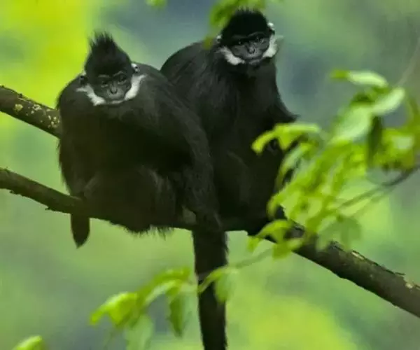 黑叶猴(学名:Trachypithecus francoisi):体长约50-60厘米,头小,尾巴较身体长,细长的四肢;头顶有直立的毛冠,体背毛比腹面的毛长而密,臀疣较大;全身黑色有光泽,耳基至两颊有白毛,手足均为黑色。以果实、种子、嫩芽和叶柄为主要食物,也吃鲜枝嫩叶、花苞、竹笋、小鸟及昆虫,食物可达80余种。