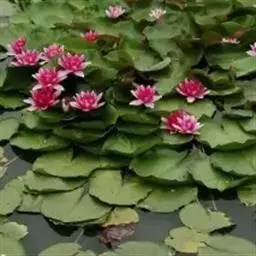 红花睡莲,多年生浮水植物。叶浮于水面,卵形,革质,表面绿色,背面紫红色,幼叶红色,花昼开夜合,浮于…