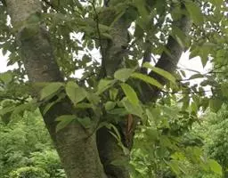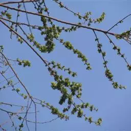 树皮暗灰色,粗糙,不规则纵裂。幼树枝条直立,且被白色毛;老树枝条先端下垂,有时木栓质发达成为瘤状。…