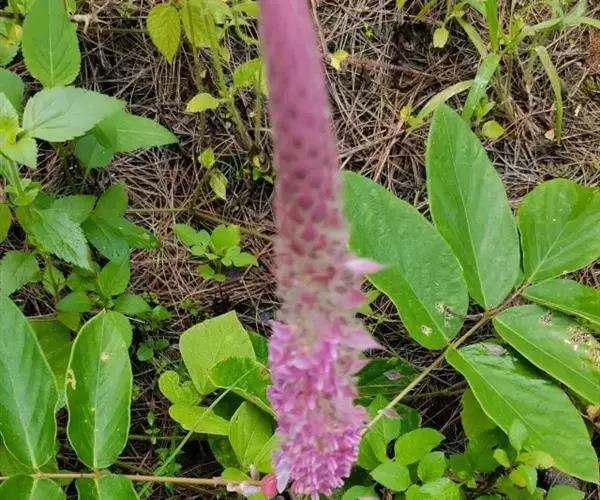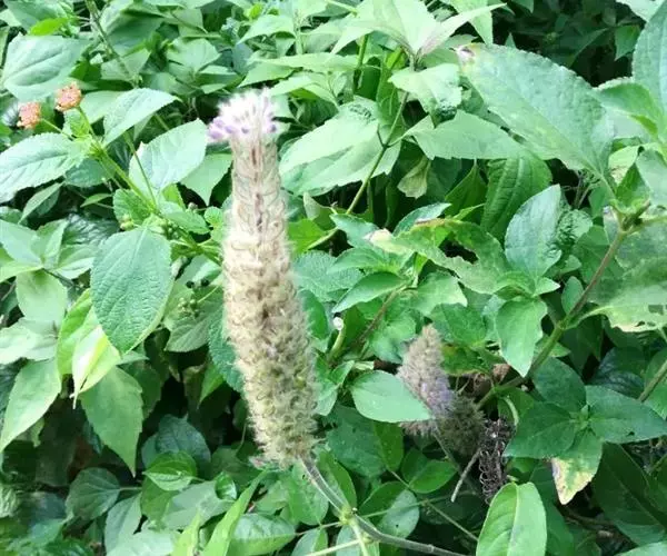总状花序顶生,长15-30厘米或更长,粗壮,密被灰白色长硬毛;苞片卵形或披针形,长达2厘米宽达7毫米,具条纹,被白色并展缘毛;花梗长约4毫米,花后伸长至10-15毫米,弯曲,被短钩状毛和白色长毛;花萼浅杯状,被白色长硬毛,5裂,上部2裂长约3毫米,下部3裂长3.5毫米;花冠紫色,长6毫米。