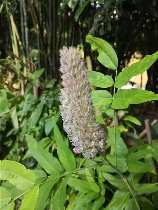 猫尾草(学名:Uraria crinita (L.) Desv. ex DC.)是豆科 ,狸尾豆属多年生亚灌木植物;茎直立,高可达1.5米.分枝少,叶片为奇数羽状复叶,托叶长三角形,先端细长而尖,边缘有灰白色缘毛;叶柄被灰白色短柔毛;小叶近革质,侧生小叶略小,上面无毛或于中脉上略被灰色短柔毛,下面沿脉上被短柔毛,在两面均凸起,下面网脉明显;小托叶狭三角形,小叶柄长密被柔毛。总状花序顶生,粗壮,苞片卵形或披针形,花梗花后伸长弯曲,花萼浅杯状,花冠紫色,荚果略被短柔毛;4-9月开花结果。