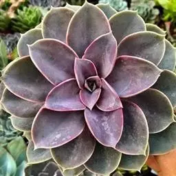 紫珍珠是景天科石莲花属的多年生肉质草本植物。植株中小型;叶片肉质,匙形,呈莲座状紧密排列;叶片粉紫色,…