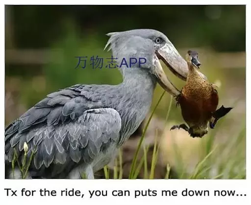 在东非国家乌干达,凶狠异常的鳄鱼有一个奇异的天敌,这是一种鸟就是鲸头鹳,被当地人称之为“鞋之父”,该种鸟有这个怪名,不是因为它会做鞋,当然也不是因为它“发明”了鞋,而是因为它的鸟喙很像鞋,尤其特别像荷兰人的木鞋。“鞋之父”鸟是一种大鸟,通常身高1.4米,体重7千克,两翼展开时宽达2.6米。它捕食幼小鳄鱼的方式也很独特。它站在水中,将喙靠在胸膛边,一动不动半天之久,远处看去,活像一快树立在水中的纪念碑。没有经验的小鳄鱼,不知就里,终于上当,游到了它的脚下,刹那间,“鞋之父”鸟飞身潜水,然后立即穿出水面,尖喙夹着已经死亡的小鳄鱼直上云天,后又落在一块岩石上享受美味佳肴。“鞋之父”鸟捕捉鳄鱼时极为神速,吃起来却大费时间。原来,鳄鱼上缠着许多像面条一样的水草,必须去掉。“鞋之父”鸟在岩石上耐心地翻抖鳄鱼,直到水草脱落,这至少需要15分钟时间。这种鸟主要生活在乌干达的基奥加湖(Kyoga)。不仅爱吃甲鱼,而且连其龟甲也能吞进,消化力之强,令人瞠目。
