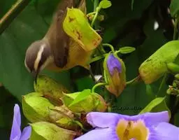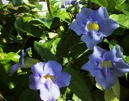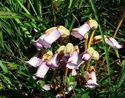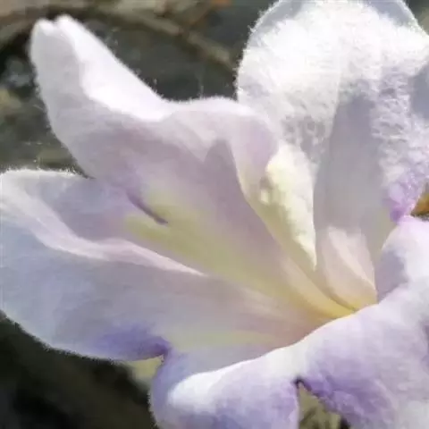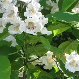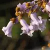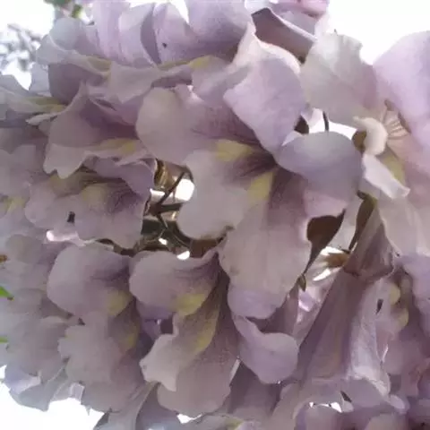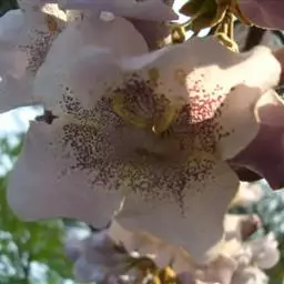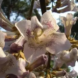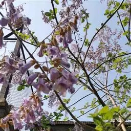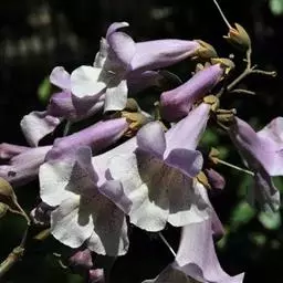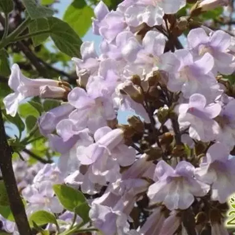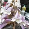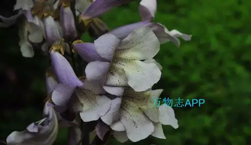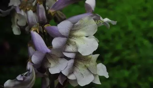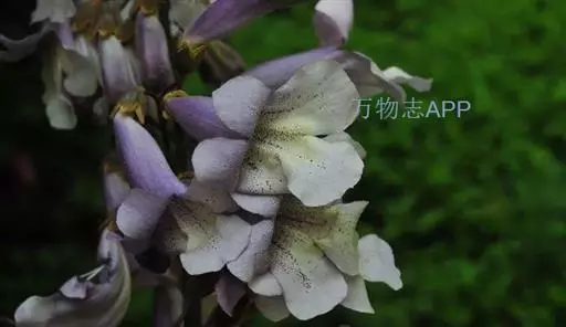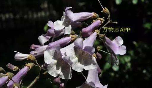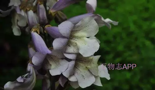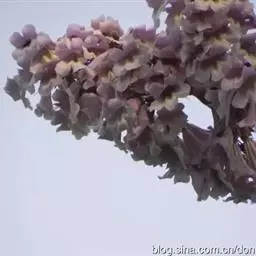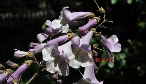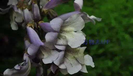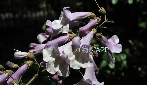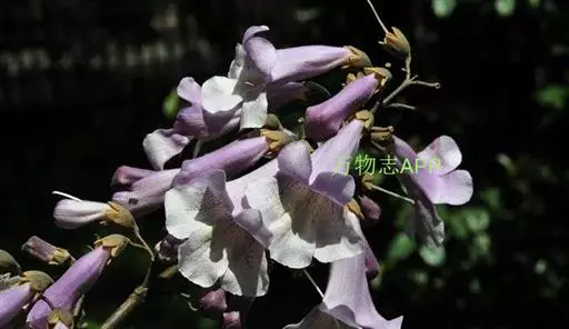 花序枝的侧枝不发达,故花序金字塔形或狭圆锥形,长约30厘米,小聚伞花序的总花梗长8-20毫米,几与花梗等长,有花3-5朵,稀有单花;萼倒圆锥形,长16-20毫米,基部渐狭,分裂至1/3左右成5枚卵状三角形的齿,管部的毛易脱落;花冠漏斗状钟形,紫色至粉白色,长7-9.5厘米,管在基部以上稍弓曲,外面有腺毛和星状毛,内面无毛而有紫色细小斑点,檐部略作2唇形,直径4-5厘米;雄蕊长达25毫米;子房和花柱有腺,花柱长30-35毫米。蒴果卵形,稀卵状椭圆形,长3.5-5厘米,有星状绒毛,宿萼碟状,顶端具长4-5毫米的喙,果皮厚1-2.5毫米;种子连翅长约4-5毫米。花期4-5月,果期秋季。