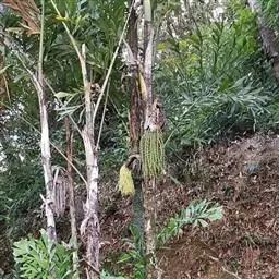 花序生于叶鞘之下,呈圆锥花序式,长约0.8米,具2-3次分枝,分枝花序长20-30厘米,其上有8-10个小穗轴,长12-18厘米;花小,卵球形,金黄色,螺旋状着生于小穗轴上;雄花萼片和花瓣各3片,上面具条纹脉,雄蕊6,花药多少丁字着;雌花萼片和花瓣与雄花的略同,子房1室,具短的花柱和粗的柱头。