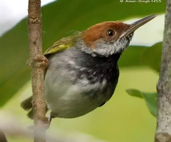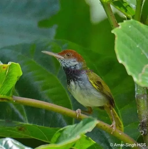 黑喉缝叶莺(学名:Orthotomus atrogularis):体长11.5厘米,是一种小型的顶冠棕色、腹部白色的莺。尾甚长而常上翘,臀黄色,具特征性的偏黑色喉(亚成鸟喉无黑色),上体橄榄绿色,头侧灰色。雌鸟色暗,头少红色且喉少黑色。与长尾缝叶莺的区别在后顶冠亦为棕色,无白色眉纹,背上绿色较重,尾下覆羽及腿部黄色。虹膜褐色;上嘴黑,下嘴偏粉;脚粉灰色。