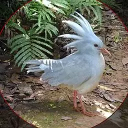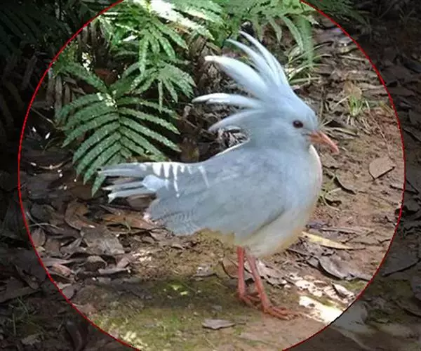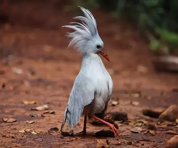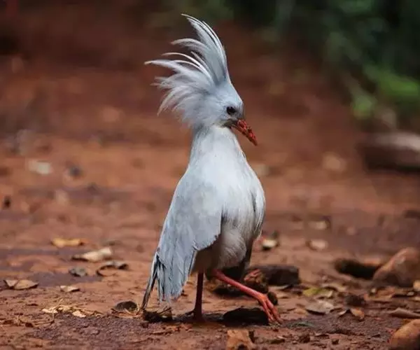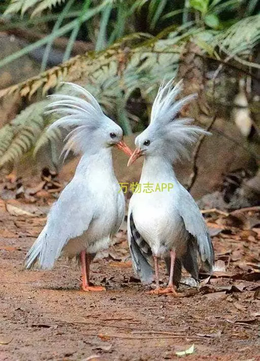 成鸟羽色为明亮的灰白色(森林走禽一般颜色偏暗)。羽冠长而蓬松,炫耀或抖落粉尘时可以竖立。喙、腿桔红色,眼深桔红色。 翅上覆羽和尾部羽色较深,呈灰蓝色。下体大致白色,仅喉和胸部杂有少量浅灰羽毛。翅形大,展开时可见初级飞羽上有明显的黑、白交错斑纹。喙基部有保护鼻孔的胼胝状组织覆盖(该特征任何其他鸟类都不具备),周围散布几缕嘴须。