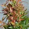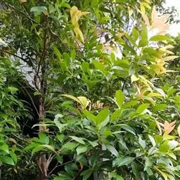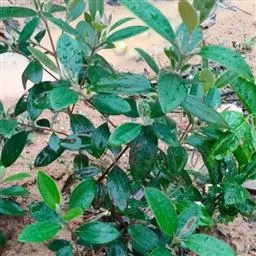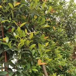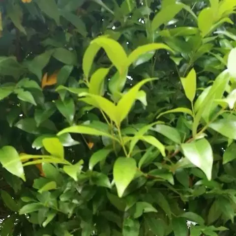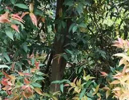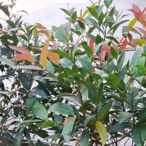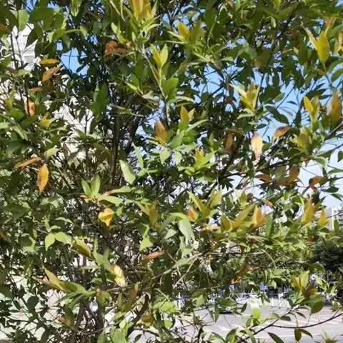 常绿灌木,成长缓慢,树高4-15米,枝梢分枝与成枝能力较强,树姿开张,树冠为自然圆头形。根系分布较浅,深度小于70厘米,以须根为主。树皮细薄,呈灰白色或浅褐色至微红色,具有缓慢脱落特性;果实采收后至萌发新芽期间,老旧树皮会剥落。叶对生,叶柄短,有茸毛,叶片革质,深绿色有光泽,披针形或椭圆形。