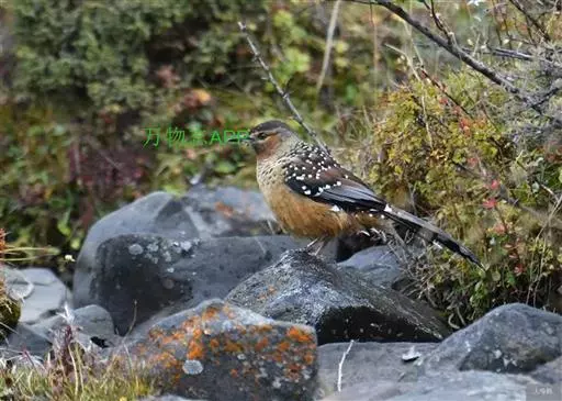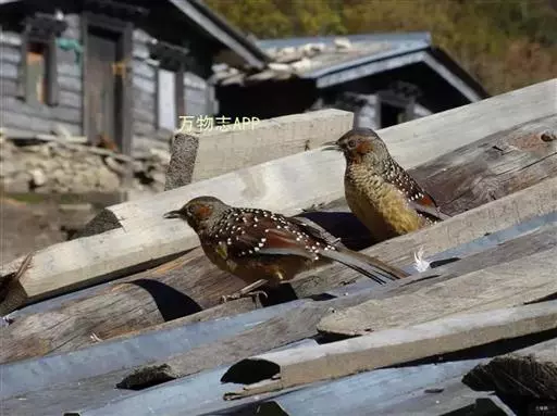 大噪鹛(学名:Garrulax maximus):中型鸟类,体长32-36厘米。额至头顶黑褐色,背栗褐色满杂以白色斑点,斑点前缘或四周还围有黑色。初级覆羽、大覆羽和初级飞羽具白色端斑。尾特长,均具黑色亚端斑和白色端斑。颏、喉棕褐色,喉具棕白色端斑和窄的黑色亚端斑,其余下体棕褐色。野外特征极明显,容易识别。相似种眼纹噪鹛体型较小,尾亦较短,喉和颈侧黑色,胸具黑白相间横斑。区别较明显,野外不难鉴别。