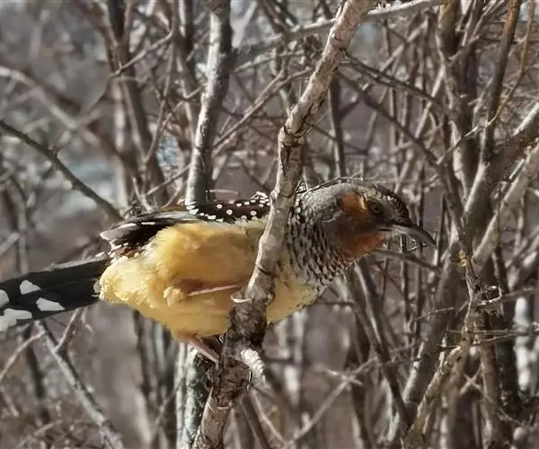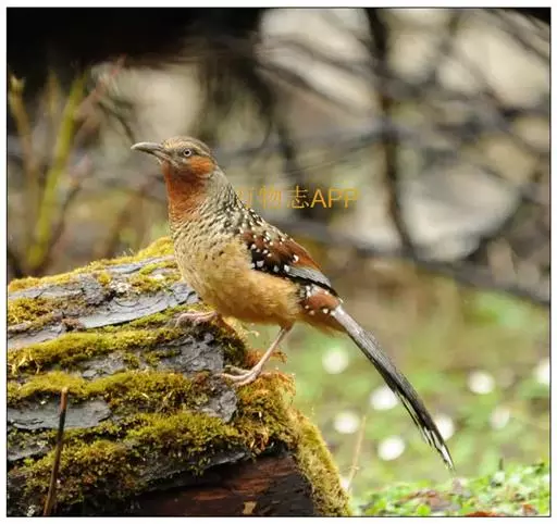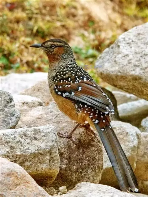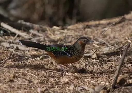 野外鉴别特征:中型鸟类,体长32-36厘米。额至头顶黑褐色,背栗褐色满杂以白色斑点,斑点前缘或四周还围有黑色。初级覆羽、大覆羽和初级飞羽具白色端斑。尾特长,均具黑色亚端斑和白色端斑。颏、喉棕褐色,喉具棕白色端斑和窄的黑色亚端斑,其余下体棕褐色。野外特征极明显,容易识别。