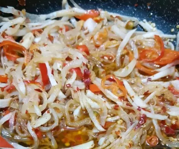 2、锅架火上放油,下姜片,烹绍酒,加味精、精盐,去姜片后倒入金针菇、黄瓜丝、笋丝、炒拌均匀,洒上麻油,出锅装盘。