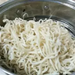 1、将金针菇切一刀,和笋丝一起焯一下,倒出沥净水分;