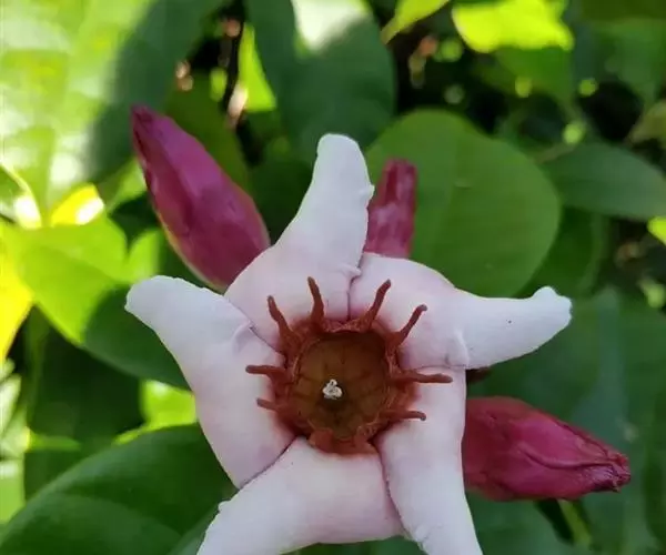 粗壮常绿攀援灌木,全株无毛;枝条干后红褐色,具白色皮孔,老枝条具纵条纹。叶厚纸质,长圆形或长圆状椭圆形,长9-15厘米,宽4-7.5厘米,顶端急尖,基部圆形或阔楔形;中脉在叶面扁平,在叶背凸起,侧脉每边6-8条,两面均扁平;叶柄长约1厘米,扁平;叶腋内具2枚钻状腺体。聚伞花序顶生,伞形,具短总花梗,着花6-8朵,无毛;花萼钟状,裂片倒卵形,长12毫米,宽6毫米,花萼内面基部有12枚腺体;花冠白色,喉部染红色,花张开后直径5厘米,花冠裂片倒卵形,顶端不延长成尾状,花冠筒上部膨大;副花冠为10枚舌状鳞片所组成,着生在冠檐喉部,鳞片基部合生,顶端离生并伸出花喉外,红色;雄蕊内藏,花药靠合在柱头上,药隔顶端丝状,花丝离生,被微毛;子房卵圆状,无毛,花柱丝状,柱头棍棒状。花期2月。
