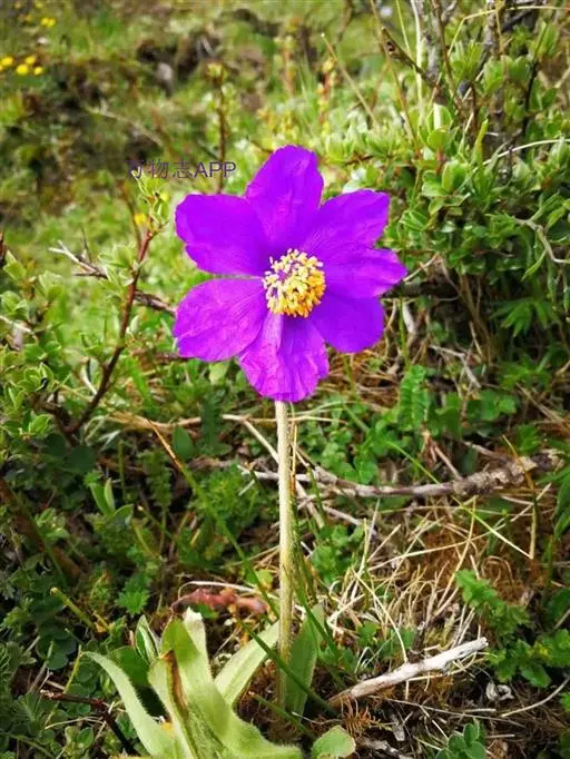一年生草本。主根短而肥厚,圆锥形,长4-6厘米,粗约1厘米。叶全部基生,叶片倒披针形或长圆状倒披针形,长3-8厘米,宽0.5-1.5厘米,先端钝或圆,基部渐狭而入叶柄,边缘全缘或波状,稀具疏锯齿,两面被黄褐色、卷曲的硬毛;叶柄线形,长2-6厘米。花葶高15-20厘米,被黄褐色平展、反曲或卷曲的硬毛。花1(-11)朵,单生于基生花葶上;花芽宽卵形,长的1厘米,宽约1.5厘米;萼片边缘薄膜质,外面被黄褐色、卷曲的硬毛;花瓣5-9,卵形或倒卵形,长4-5厘米,宽2-3.8厘米,先端圆或钝,深蓝紫色或紫色;花丝上部1/3丝状,下部2/3突然扩大成条形长约1.5厘米,与花瓣同色,花药长约1毫米,橘红色或浅黄色;子房卵珠形或近球形,长约5毫米,密被黄褐色紧贴的硬毛,花柱长约5毫米,柱头长约5毫米,裂片分离或连合成棒状。蒴果椭圆状长圆形或狭倒卵珠形,长约2厘米,疏被硬毛,4-6瓣自顶端微裂。种子镰状长圆形,种皮具纵条纹或浅凹痕。花果期6-9月。
