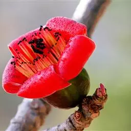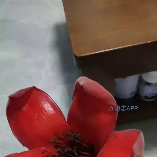 药材性状:花朵全长5~8厘米,干时皱缩,呈不规则的块状,多不具子 花期木棉全株 房和花柄。花萼杯状,长2.5~4厘米,直径2~3厘米,顶端3~5裂,厚革质,甚脆,外表棕黑色,有纵皱纹,内面被灰黄色短绒毛。花瓣5片,皱缩或破碎,面棕黄色或深棕色,被星状毛,内面红棕色,星状毛较少;雄蕊多数,排成多列,基部合生,花药肾形,卷曲。气微,味淡微甘。以朵大完整,色棕黄者为佳。