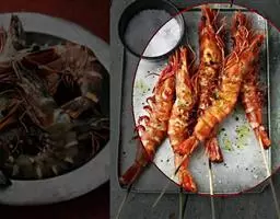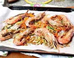 用小刀从海虾的腹部轻轻划开,虾展开后用刀划细小格子刀,但不要切断,依照这个方法,处理好所有的虾