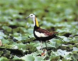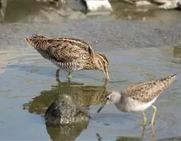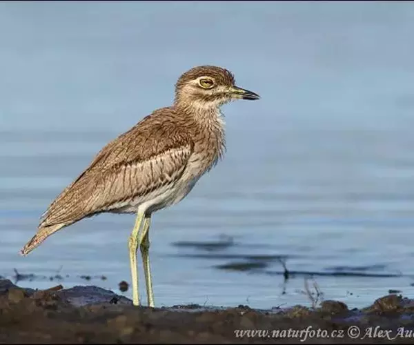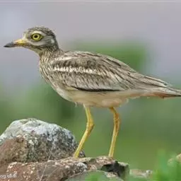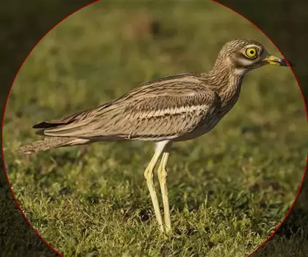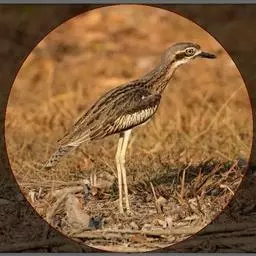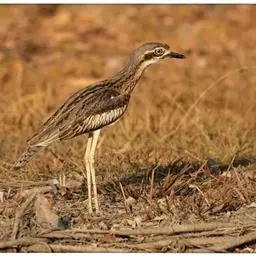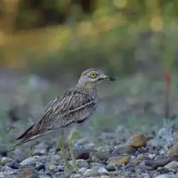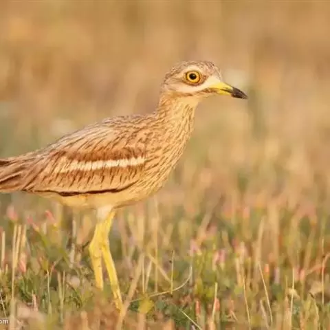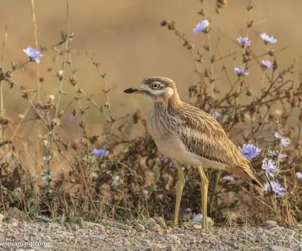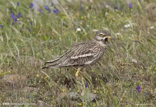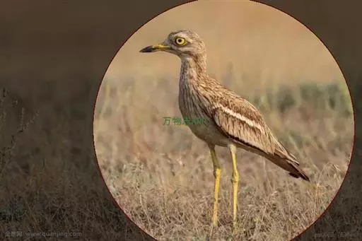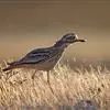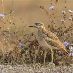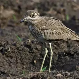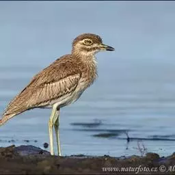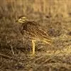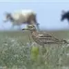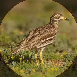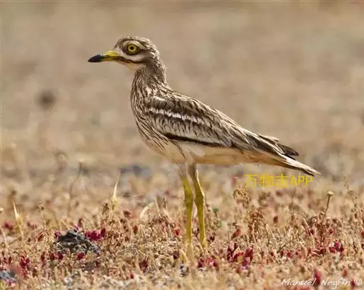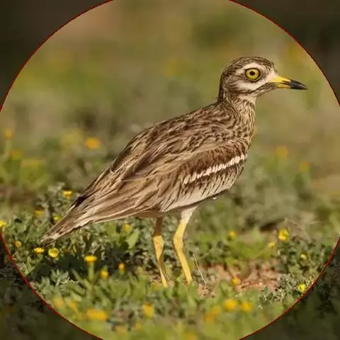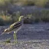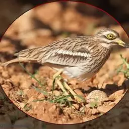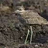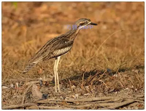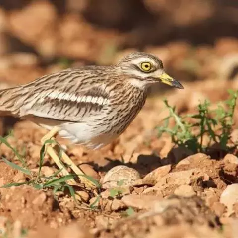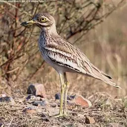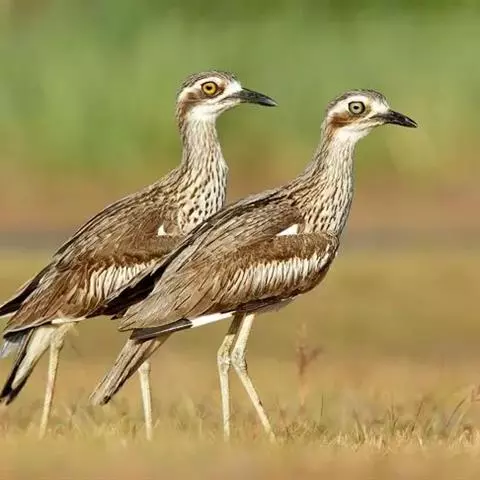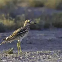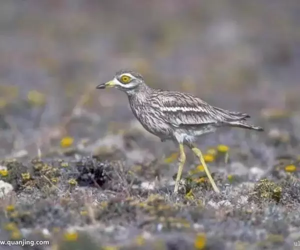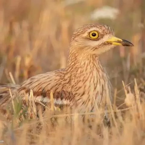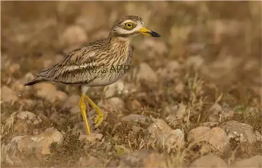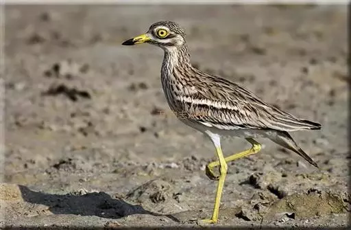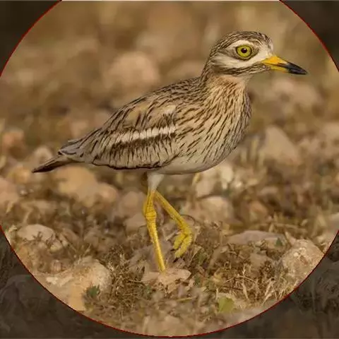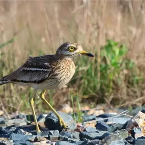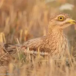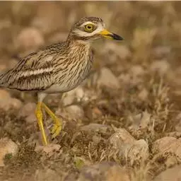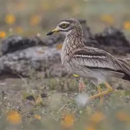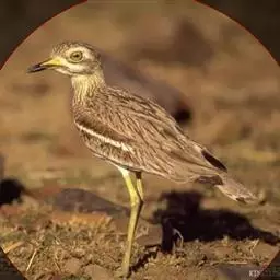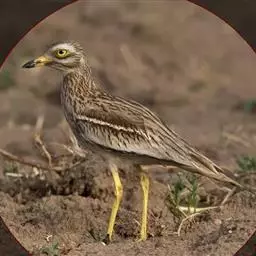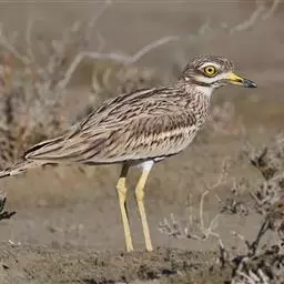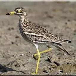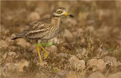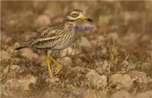 石鸻(学名:Burhinus oedicnemus),是石鸻科、石鸻属的中型涉禽,体长40-45厘米。嘴粗厚、尖端黑色,基部黄色。脚长而粗、黄色,3趾,后趾缺失。上体淡沙灰褐色具黑褐色纵纹,前额和眼先白色。眼特别大、黄色,其外有一窄的黑圈,再外又围有更宽的白色并向后延伸,形成一道显著的白眉,在上下缘的黑色带斑衬托下极为醒目。在背的两侧靠近翅处,有一白色和黑褐色纵带。下体污白色,前颈和胸缀有皮黄灰色亦具黑纹,飞翔时黑色初级飞羽上有白斑,翅下白色。