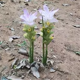 株高15~30厘米;根茎块状,径约1厘米,外面棕褐色,内面棕黄色,粉质,芳香而有辛辣味,根末端膨大成球形的块根。叶片倒卵状长圆形或披针形,长10~18厘米,宽2~3.5 厘米,绿色或染紫;叶柄长6~18厘米。花10~15朵聚生于钟状的总苞中,总苞长4~5厘米,宽2~2.5厘米,顶2~3裂,总苞及花的各部常有棕色、透明的小腺点;总花梗长2.5~10厘米;小苞片线形,膜质,长约1.5厘米;花白色,萼管长9~11毫米,顶端浅3裂;花冠管长2.5~2.7厘米,裂片长圆形,长约1.2厘米,后方的一片稍较大,顶端具小尖头;侧生退化雄蕊倒披针形,长1.6~2厘米,宽约4毫米;唇瓣倒卵状匙形,长约2厘米,上部宽1.3厘米,深裂至5毫米处,白色,中央有杏黄色斑,内被长柔毛,生活时唇瓣与侧生退化雄蕊卷成筒状,露出于总苞之上;花药长5毫米,花丝长2 毫米;药隔附属体半圆形,长约3毫米;花柱线形,柱头具缘毛;子房卵形,长3.5毫米。花期:5~6月。