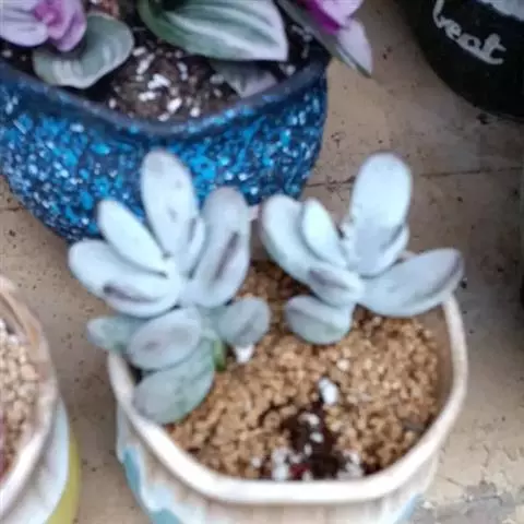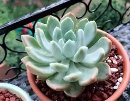 福娘为景天科银波锦属的肉质草本植物。对生的叶片呈短棒状,叶色灰绿,表覆白粉,叶缘外围镶着紫红色,…