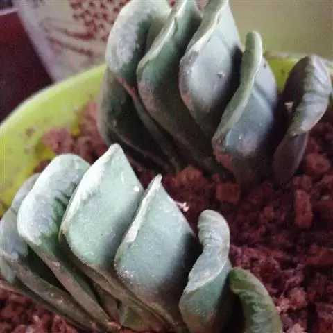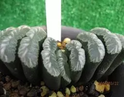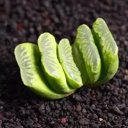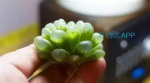 冰灯玉露的株形较大,单株直径有7~10厘米,更长不成群生的植株,其肉质叶顶端非常通透,像冰一样透亮,叶缘有毛刺,但顶端没有毛,肉质叶上端深色线条达不到。由于冰灯玉露基本不出侧芽,致其繁殖速度极慢。