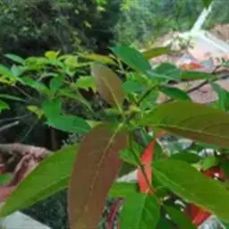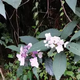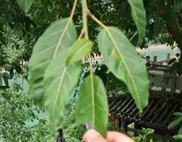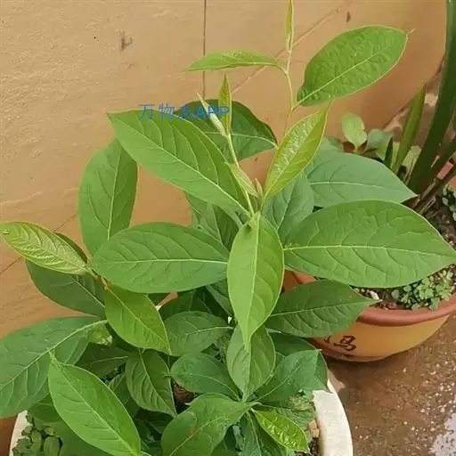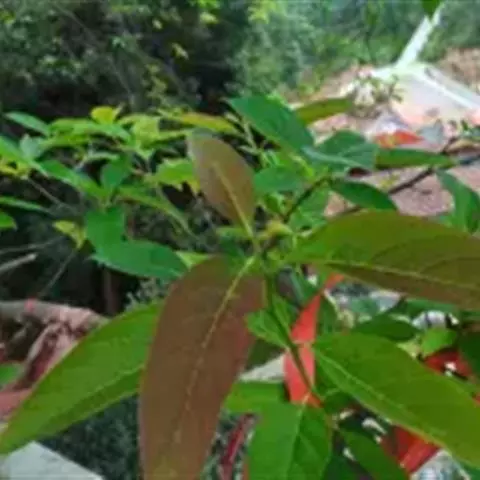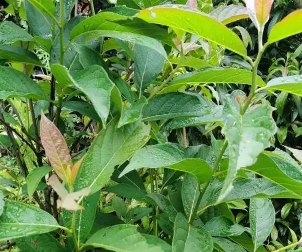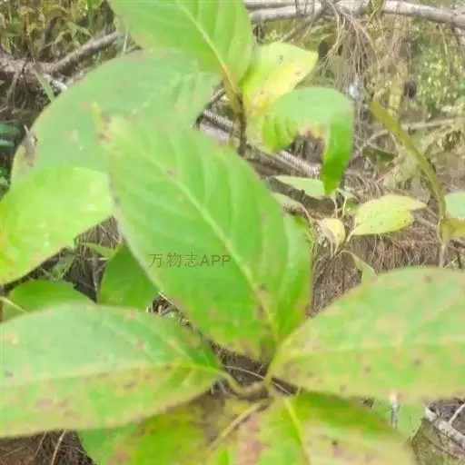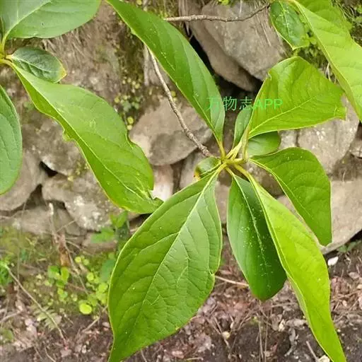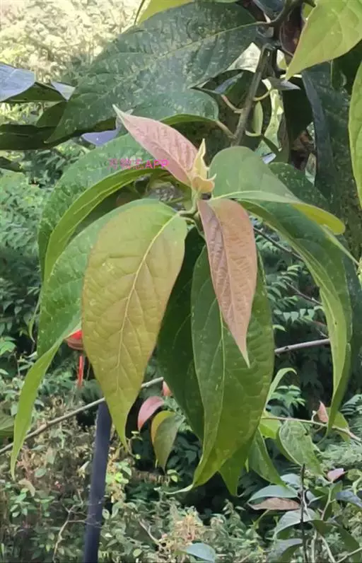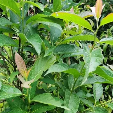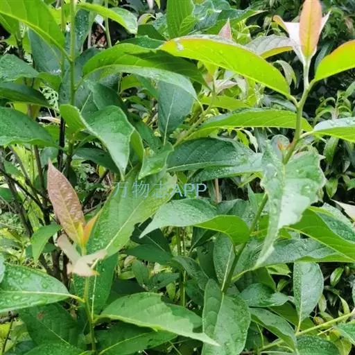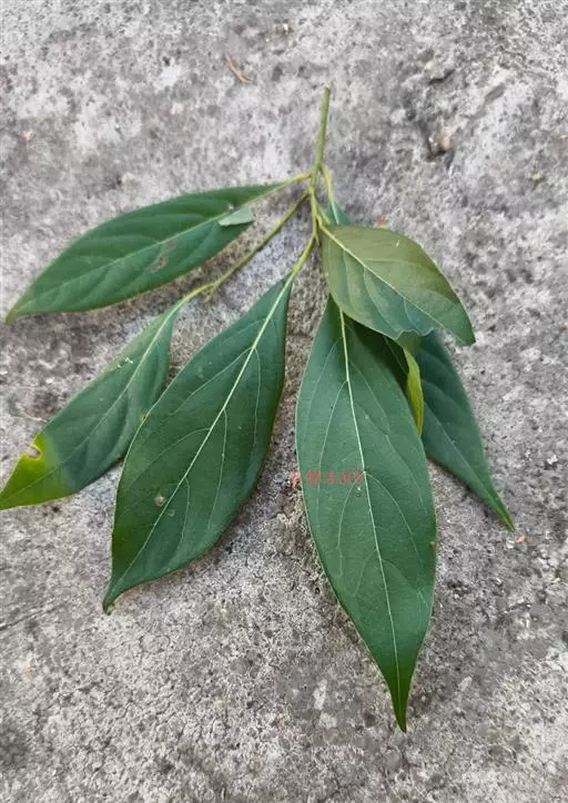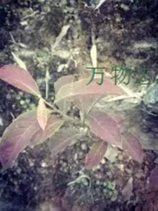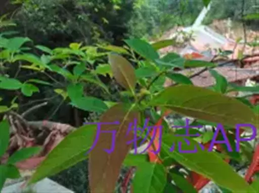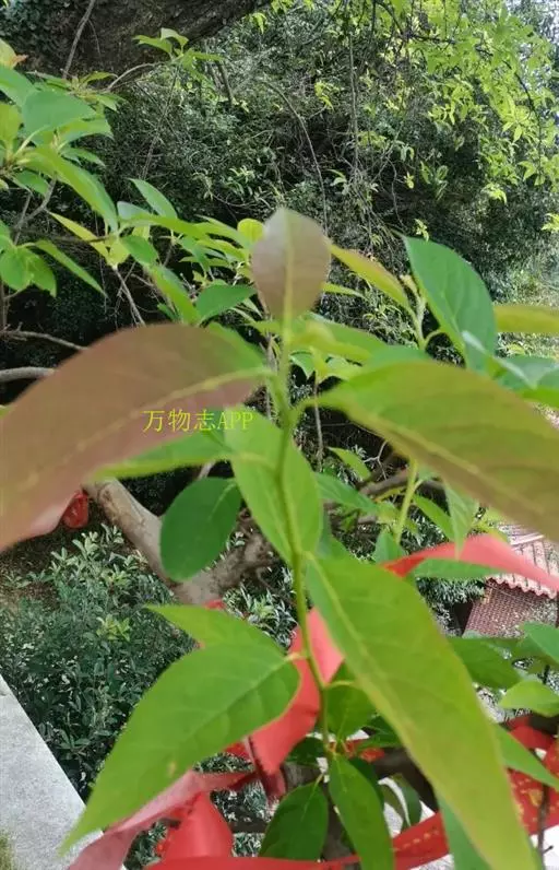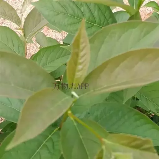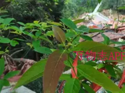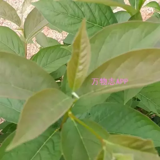 叶纸质或薄革质,互生,椭圆形或长椭圆形,稀卵形或近披针形,长12-15厘米,宽5-6厘米,稀达8厘米,顶端短急锐尖,基部近圆形,边缘略呈浅波状,上面无毛,深绿色,干燥后深紫色,下面淡绿色,有很稀疏的微柔毛,中脉和6-10对侧脉均在上面微现,在下面显著;叶柄淡紫绿色,长1.5-2厘米,上面稍扁平或微呈沟状,下面圆形。