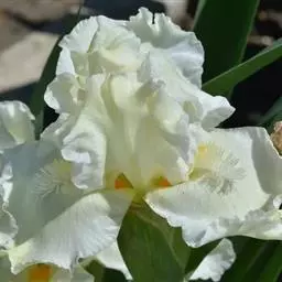 球根花卉,叶披针形、对折,基部为鞘状,全缘,中肋明显,光滑,绿色,有光泽,成熟期叶片8~11枚;双花茎,花顶生,着花1~2朵,花茎长50.0~75.0厘米、粗0.75~1.10厘米;花蝶形辐射对称,花径11.0~16.0厘米;垂瓣3枚,心形,黄色,具琴状瓣柄,中央部具匙形橙黄色条斑,瓣缘向下弯垂,长7.0~11.5厘米、宽3.0~5.0厘米;旗瓣3枚,长椭圆形,斜立,白色中略带淡紫色,长6.0~11.0厘米、宽2.0~3.0厘米;地下球茎卵圆形,外被褐色皮膜;每粒母球茎花后可形成1粒卵圆形中心球和4~7粒子球,平均繁殖系数达5.54;成熟开花商品球茎周径8~12厘米,少数可达14厘米。株高约60-80公分,地下麟茎,植株与唐昌蒲相类似,单叶丛生,叶形为长披针形,先端尖细,基部为鞘状,叶片长出6~7枚,抽出单一花茎,花形姿态优美,有三瓣花瓣,为单顶花序,花色有金、白、蓝及深紫色。