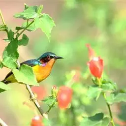 体小而色彩艳丽的太阳鸟。雄鸟:顶冠及上体闪辉深绿色,脸颊深铜红色,腹部黄,喉及胸橙褐。…