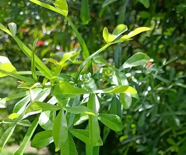 小灌木,高3-6米,胸径15-25厘米。叶簇生于小枝上;小叶3枚,长倒披针形至倒匙形,几无柄,侧生小叶2枚,长1.5-6厘米,宽1.5-2厘米,顶生小叶长5-8厘米,宽1.5-2厘米;叶柄长4-10厘米,具阔翅。 叶呈十字架形,三片小叶两两呈直角。