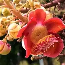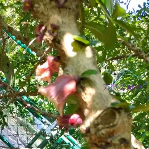 花1-2朵生于小枝或老茎上;花梗长约1厘米。花萼2裂达基部,淡紫色。花冠褐色,具有紫褐色脉纹,近钟状,具褶皱,喉部常膨胀成淡囊状,长5-7厘米,檐部成五角形。雄蕊4,插生于花冠筒下部,花药个字形着生,外露。花盘环状,淡黄色。花柱长6厘米,柱头薄片状,2裂;子房淡黄色。果近球形,直径5-7厘米,光滑,不开裂,淡绿色。