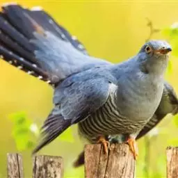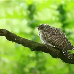 大杜鹃(学名:Cuculus canorus bakeri):是普通杜鹃的中国亚种。体长约320毫米,翅长约210毫米。雄鸟上体纯暗灰色;两翅暗褐,翅缘白而杂以褐斑;尾黑,先端缀白;中央尾羽沿着羽干的两侧有白色细点;颏、喉、上胸及头和颈等的两侧均浅灰色,下体余部白色,杂以黑褐色横斑。雌雄外形相似,但雌鸟上体灰色沾褐,胸呈棕色。又名喀咕、布谷、子规、杜宇、郭公、获谷等。