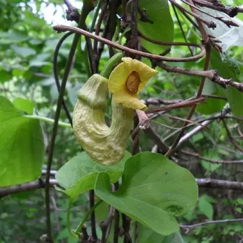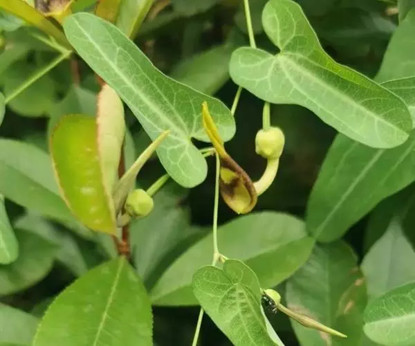 马兜铃(学名:Aristolochia debilis Sieb. et Zucc),别名水马香果、蛇参果、三角草、秋木香罐,中文名因其成熟果实如挂于马颈下的响铃而得。马兜铃为多年生的缠绕性草本植物。其根、茎、果实都称马兜铃,马兜铃有清肺降气、止咳平喘、清肠消痔的功效,其茎称天仙藤有理气、祛湿、活血止痛的功效,其根称青木香有行气止痛、解毒消肿的功效。