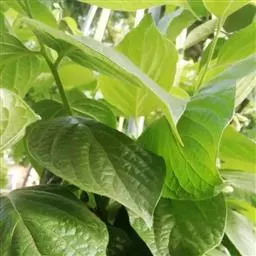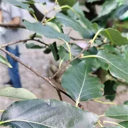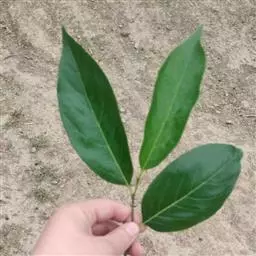 冬芽卵形,略扁,外面的芽鳞无毛,内面的密生棕色柔毛。叶纸质,长圆形、长圆状倒卵形、倒卵形,少为椭圆形,长6.5-17(20)厘米,宽3.5-10(12)厘米,先端短渐尖,基部圆形,或近圆形而两侧稍不等,或为宽楔形,边缘稍背卷,上面深绿色,下面绿色,老叶的上面变无毛,中脉在上面稍凹下,在下面凸起,侧脉每边7-9条,在上面微凹,上面稍凸起,小脉很纤细,结成小网状,上面微凹,下面微凸起,侧脉间有近横行的脉相连;叶柄长6-10毫米。