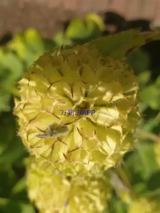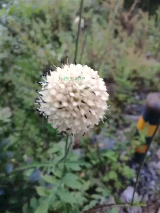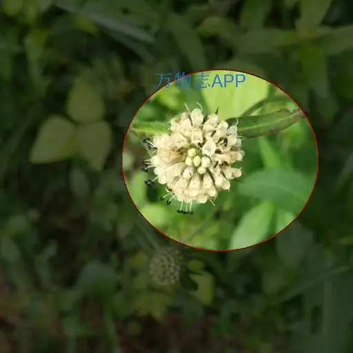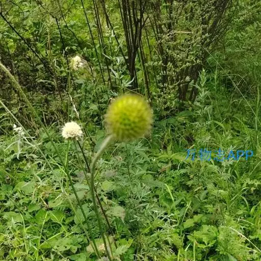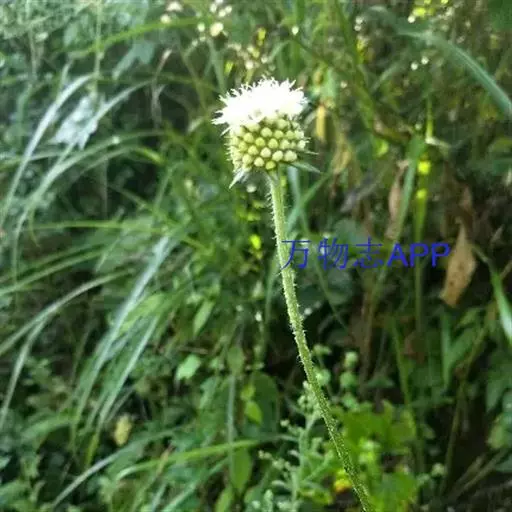 头状花序球形,径2-3厘米,总花梗长达55厘米;总苞片5-7枚,叶状,披针形或线形,被硬毛;小苞片倒卵形,长7-11毫米,先端稍平截,被短柔毛,具长3-4毫米的喙尖,喙尖两侧密生刺毛或稀疏刺毛,稀被短毛;小总苞四棱倒卵柱状、每个侧面具两条纵纵沟;花萼四棱、皿状、长约1毫光、不裂或4浅裂至深裂,外面被短毛;花冠淡黄色或白色,花冠管长9-11毫米,基部狭缩成细管,顶端4裂,1裂片稍大,外面被短柔毛;雄蕊4,着生于花冠管上,明显超出花冠,花丝扁平,花药椭圆形,紫色;子房下位,花柱通常短于雄蕊,柱头短棒状。