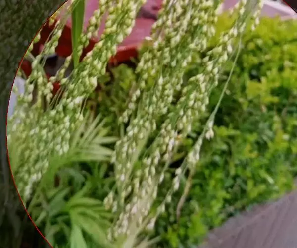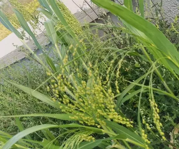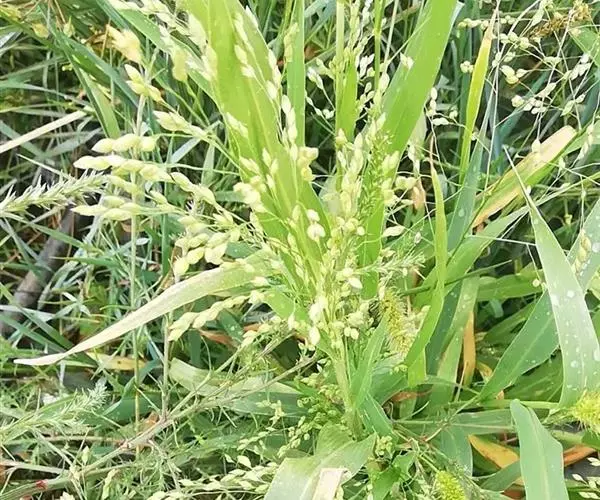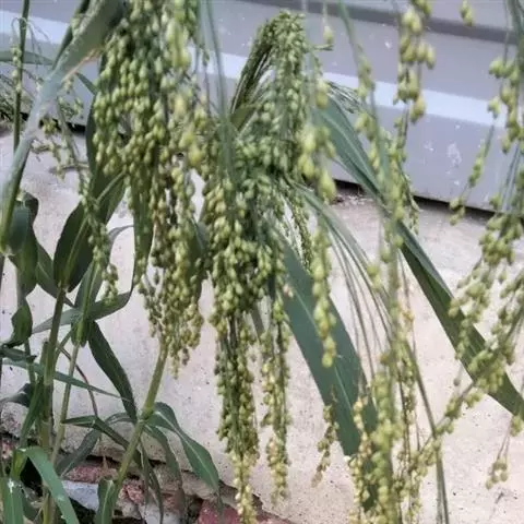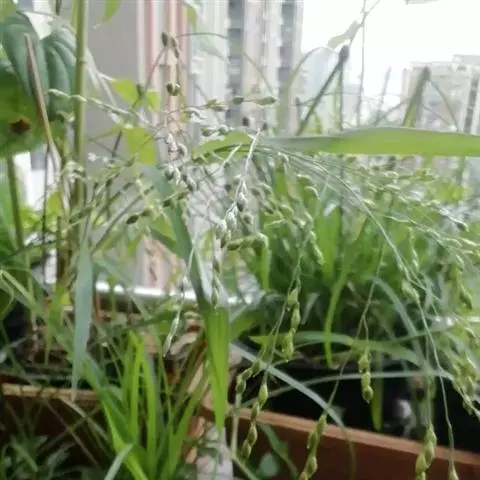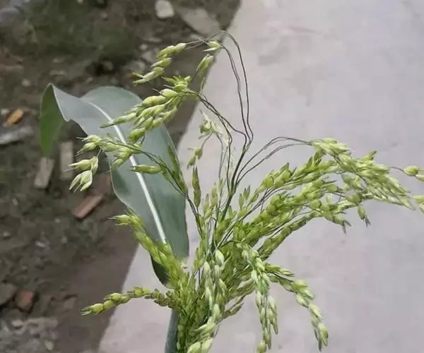 圆锥花序开展或较紧密,成熟时下垂,长10-30厘米,分枝粗或纤细,具棱槽,边缘具糙刺毛,下部裸露,上部密生小枝与小穗;小穗卵状椭圆形,长4-5毫米;颖纸质,无毛,第一颖正三角形,长约为小穗的1/2-2/3,顶端尖或锥尖,通常具5-7脉;第二颖与小穗等长,通常具11脉,其脉顶端渐汇合呈喙状;第一外稃形似第二颖,具11-13脉;内稃透明膜质,短小,长1.5-2毫米,顶端微凹或深2裂;第二小花长约3毫米,成熟后因品种不同,而有黄、乳白、褐、红和黑等色;第二外稃背部圆形,平滑,具7脉,内稃具2脉;鳞被较发育,长0.4-0.5毫米,宽约0.7毫米,多脉,并由1级脉分出次级脉。胚乳长为谷粒的1/2,种脐点状,黑色。花果期7-9月。