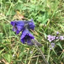 黄草乌(学名:Aconitum vilmorinianum Kom.):毛茛科,乌头属多年生草本植物,块根椭圆球形或胡萝卜形,茎缠绕,叶片坚纸质,五角形,花序有3-6花;苞片线形;萼片紫蓝色,种子三棱形,只在一面密生横膜翅。8-10月开花。