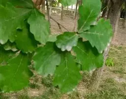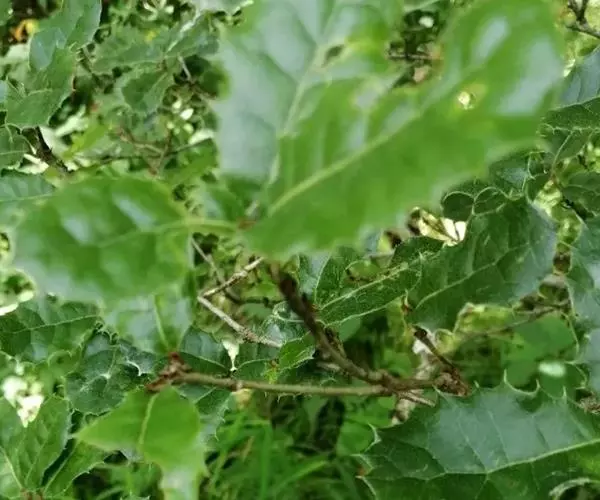 刺叶高山栎 常绿乔木或灌木,高达15米。小枝幼时被黄色星状毛,后渐脱落。叶面皱褶不平,叶片倒卵形、椭圆形,长2.5-7厘米,宽1.5-4厘米,顶端圆钝,基部圆形或心形,叶缘有刺状锯齿或全缘,幼叶两面被腺状单毛和束毛,老叶仅叶背中脉下段被灰黄色星状毛,其余无毛,中脉、侧脉在叶面均凹陷,中脉之字形曲折,侧脉每边4-8条;叶柄长2-3毫米。