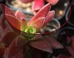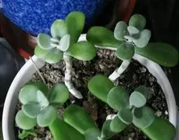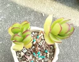 植株呈亚灌木状,高约60厘米,具小分枝,茎肉质,以后稍木质化。肉质叶灰绿 至浅绿色,叶缘稍具红色,交互对生,卵圆状三角形,无叶柄,基部连在一起,幼叶上下叠生,成叶上下有少许间隔。叶长1.5~2.5厘米,宽0.9~1.3厘米,花白色,4~5月开放。