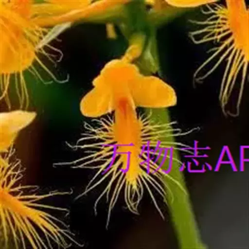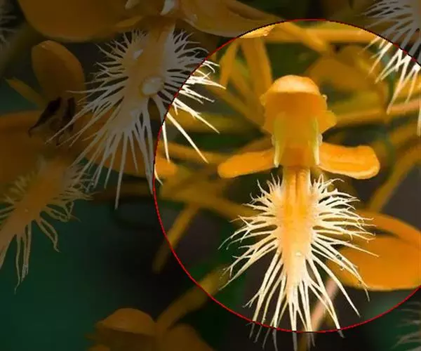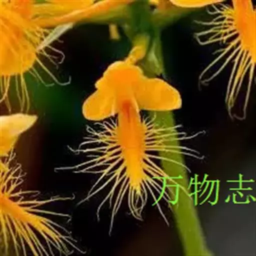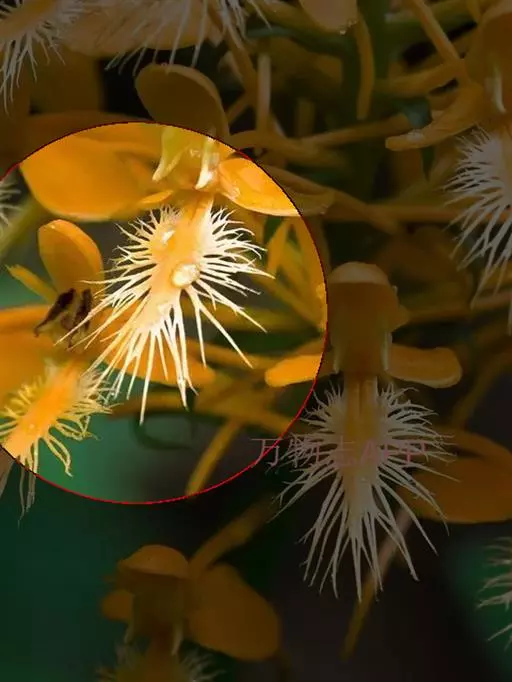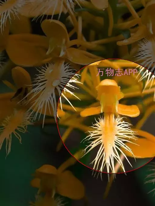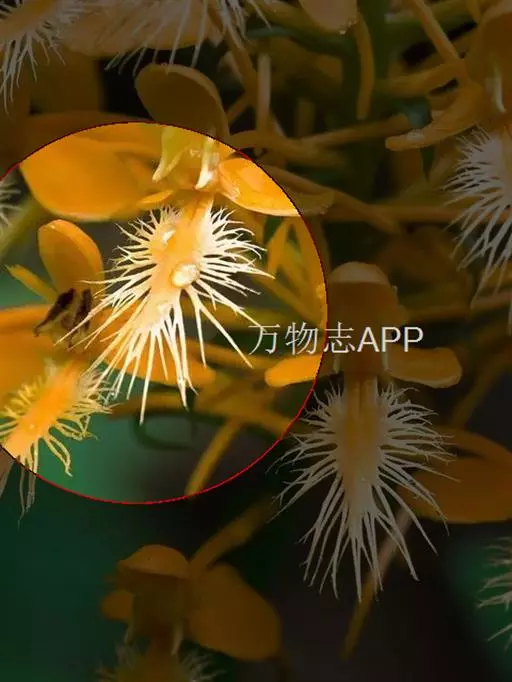 花瓣长圆形,长2.5厘米,宽7毫米,先端钝,具7条脉,全缘;唇瓣卵状三角形,长2厘米,宽15毫米,先端稍钝,基部具短爪,上面密布短绒毛,中部以下边缘具短流苏,中部以上(尤其先端)边缘具长而分枝的流苏,先端的流苏比唇瓣长;蕊柱黄色而上端两侧白色,长约3毫米;药帽浅黄白色,狭圆锥形,长约5毫米,密布细乳突,前端边缘稍不整齐。