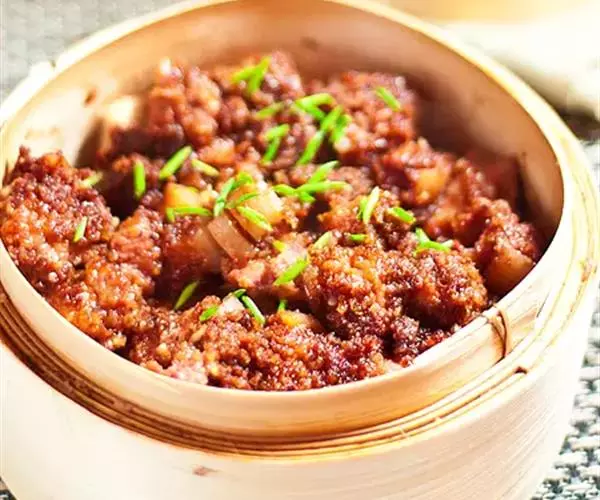 蒸排骨是一道家常菜肴,主要食材为猪排骨,相关配料有糖、盐、生粉、腐乳、蒜末、麻油、红椒等,烹饪工艺是蒸,其营养丰富,可补充蛋白质和必需的脂肪酸,能改善缺铁性贫血,是食补良品。