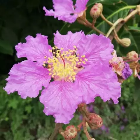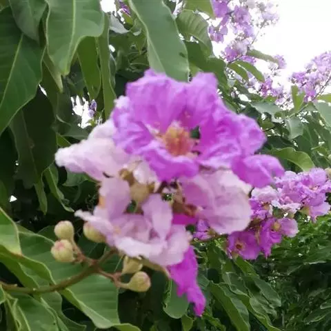 大花紫薇别名大叶紫薇。为同属常见种。半落叶乔木,叶柄短。叶革质,矩圆状椭圆形或卵状矩圆形,长10~25厘米,宽6~10厘米。花淡红色、红紫色。花期夏秋季,花期较长。