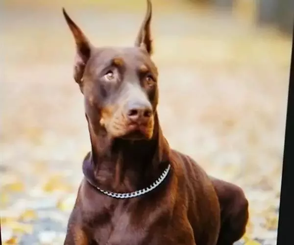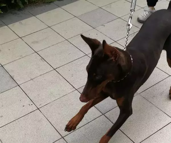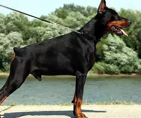 耳朵始终保持立起。暗褐色的眼睛中等大小、且呈椭圆形。鼻端是黑色的。胸很深厚,腹部收起。四肢细长有力,弹跳的能力十分好。又细又长的尾巴向下垂坠着,有点像军刀,有的杜宾犬的尾巴被断了,大约只保留5cm的长度 。