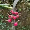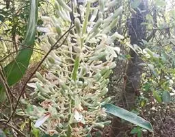 艳山姜(学名:Alpinia zerumbet (Pers.) Burtt. et Smith):姜科山姜属植物,株高可达3米,叶片披针形,基部渐狭,边缘具短柔毛,两面均无毛;圆锥花序呈总状式,下垂,花序轴紫红色,分枝极短,小苞片椭圆形,白色,顶端粉红色,蕾时包裹住花,裂片长圆形,乳白色,顶端粉红色,唇瓣匙状宽卵形,子房被金黄色粗毛;种子有棱角。4-6月开花;7-10月结果。