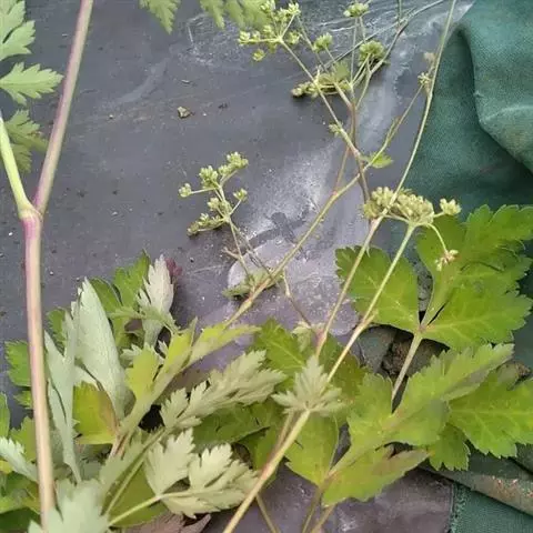 叶柄长,绿色。生长盛期其叶腋间还可长出叶片,一株叶可多达50余片。有香气。花白色或浅绿色,细小,两性花。花梗长,先端分枝,花群生成复伞形花序。