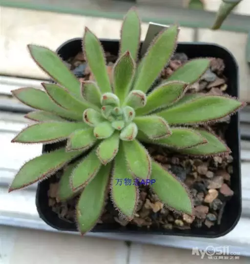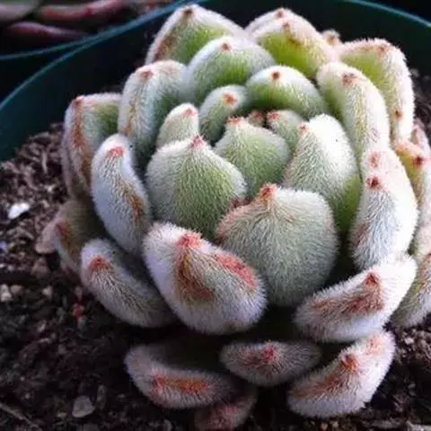 少数带绒毛的石莲花之一,与“锦晃星”类似。有红棕色绒毛。肥厚、多肉的叶片倒披针形,呈莲座状互生于分枝上部,而栽培多年植株基部的叶片常脱落,叶片绿色,表面密被白色、细短毫毛,在冷凉时期阳光充足的条件下,叶缘及叶片上部均呈深红色。很美丽。