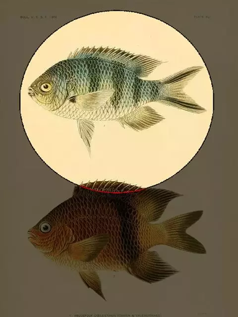 马夫鱼。成鱼体甚侧扁,背缘高而隆起,略呈三角形。背鳍鳍棘11根,第四鳍棘延长呈鞭状,鳍膜亦随之延长…