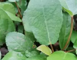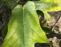 叶革质,三角状卵形,长9-17厘米,宽8-12厘米,表面深绿色,光亮,背面绿色,先端骤尖,顶部延伸为尾状,尾尖长2-5厘米,基部宽截形至浅心形,全缘或为波状,基生叶脉三出,侧脉5-7对;叶柄纤细,有关节,与叶片等长或长于叶片;托叶小,卵形,先端急尖。