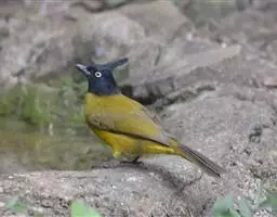 黑头鹎:体长17厘米。是一种中等体型的偏黄色鹎。特征为头辉黑、喉黑而眼蓝。上体黄橄榄色;两翼及尾偏黑,…