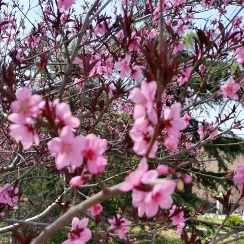 ①生物特性独特:乔木,高3-7米,树型直立,树冠圆形,枝条暗紫红色,叶片椭圆形,锯齿钝。春、夏、秋三季其叶色始终以紫色为基调深浅变化,叶片上有金属般的光亮,整个树给人以光彩四溢的感觉。4月上旬始花,花蕾暗黑红色,开后逐渐转为暗红色至深紫红色;花瓣6-10数,排成两轮,花梗直立,花直径5cm,花萼筒紫黑色,光滑,萼齿细长,内被稀毛。果实球形,黑红色,直径1.5cm,表面被霜状蜡质。果萼宿存,是最具观赏价值的紫叶品种。