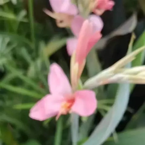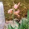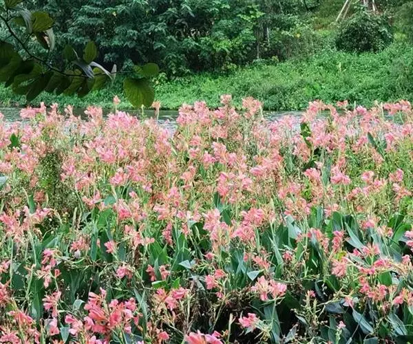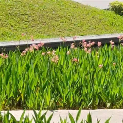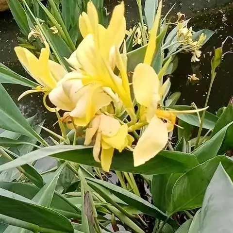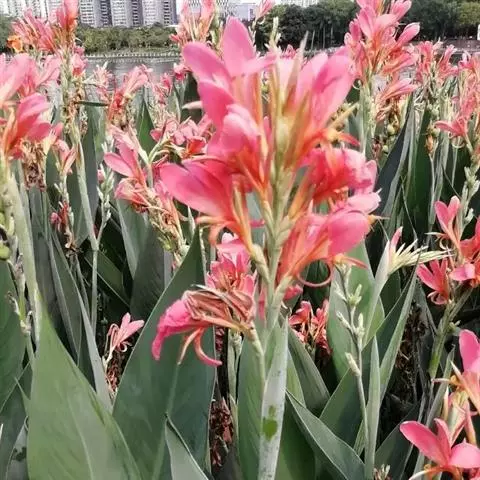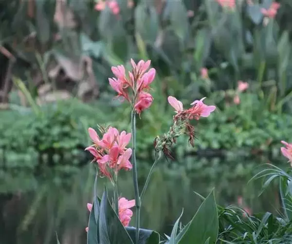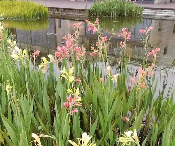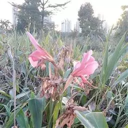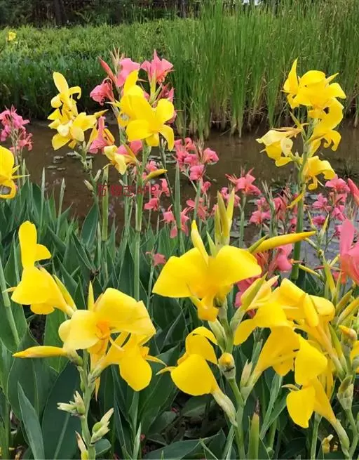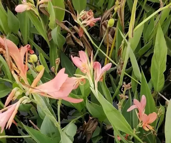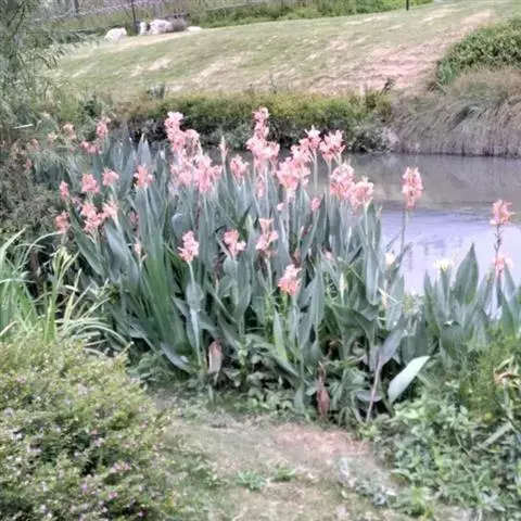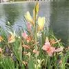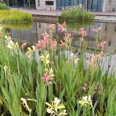 粉美人蕉(学名:Canna glauca L.):是一种球根草本植物。根茎延长,株高1.5-2米;茎绿色。叶片披针形;总状花序疏花,单生或分叉,稍高出叶上;苞片圆形,褐色,花黄色,无斑点;有多种园艺栽培品种,颜色从粉、橙红色及具带红色斑点等。花期:夏、秋。