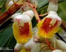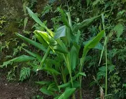 粉美人蕉是一种球根草本植物。根茎延长,株高1.5-2米;茎绿色。叶片披针形,长达50厘米,宽10-15厘米,顶端急尖,基部渐狭,绿色,被白粉,边绿白色,透明;总状花序疏花,单生或分叉,稍高出叶上;苞片圆形,褐色,花黄色,无斑点;萼片卵形,长1.2厘米,绿色;花冠管长1-2厘米;花冠裂片线状披针形,长2.5-5厘米,宽1厘米,直立,外轮退化雄蕊3,倒卵状长圆形,长6-7.5厘米,宽2-3厘米,全缘;唇瓣狭,倒卵状长圆形,顶端2裂,中部卷曲,淡黄色;发育雄蕊倒卵状近镰形,顶端急尖,内卷;花柱狭披针形。蒴果长圆形,长3.5厘米。花期